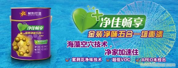 『紫荆花』净佳畅享金装净味五合一墙面漆,采用优质丙烯酸聚合物乳液,结合紫荆花创新净味技术精制而成,超低VOC含量,APEO未检出,气味清新,环保健康。独特的海藻空穴技术,实现快速净味的同时,更具有强力弥盖细微裂纹的功能。另外,紫荆花表面固化技术,使漆膜更加致密,突破性实现超五万次耐擦洗及优异抗污功能。同时,还具备防霉抗碱、防水透气等更多强效功能,全方位保证墙面完美亮丽效果,特别适合家居和公共场所内墙的涂装。
